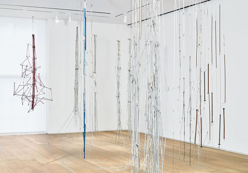 The architectural dimension of Gego’s art was well demonstrated in the exhibition in the reunification of works from the artist’s Chorros installation, which debuted at the Betty Parsons Gallery in 1971. The Chorros are towering sculptures made of interconnected wires that extend from the ceiling and cascade down to the floor, most of them emphatically vertical in orientation (Chorro means waterfall); they interrupt the space of the gallery so that the viewer has to wend his or her way among them. While fundamentally abstract, the wires in many of the Chorros splay in graceful fashion as they extend onto the floor, evoking a spray of water, but also a person’s dancelike step. The totemic quality of the sculptures is accentuated in Chorro No.9, in which an artful distribution of wires in space suggests the enlarged belly and breasts of a pregnant woman.