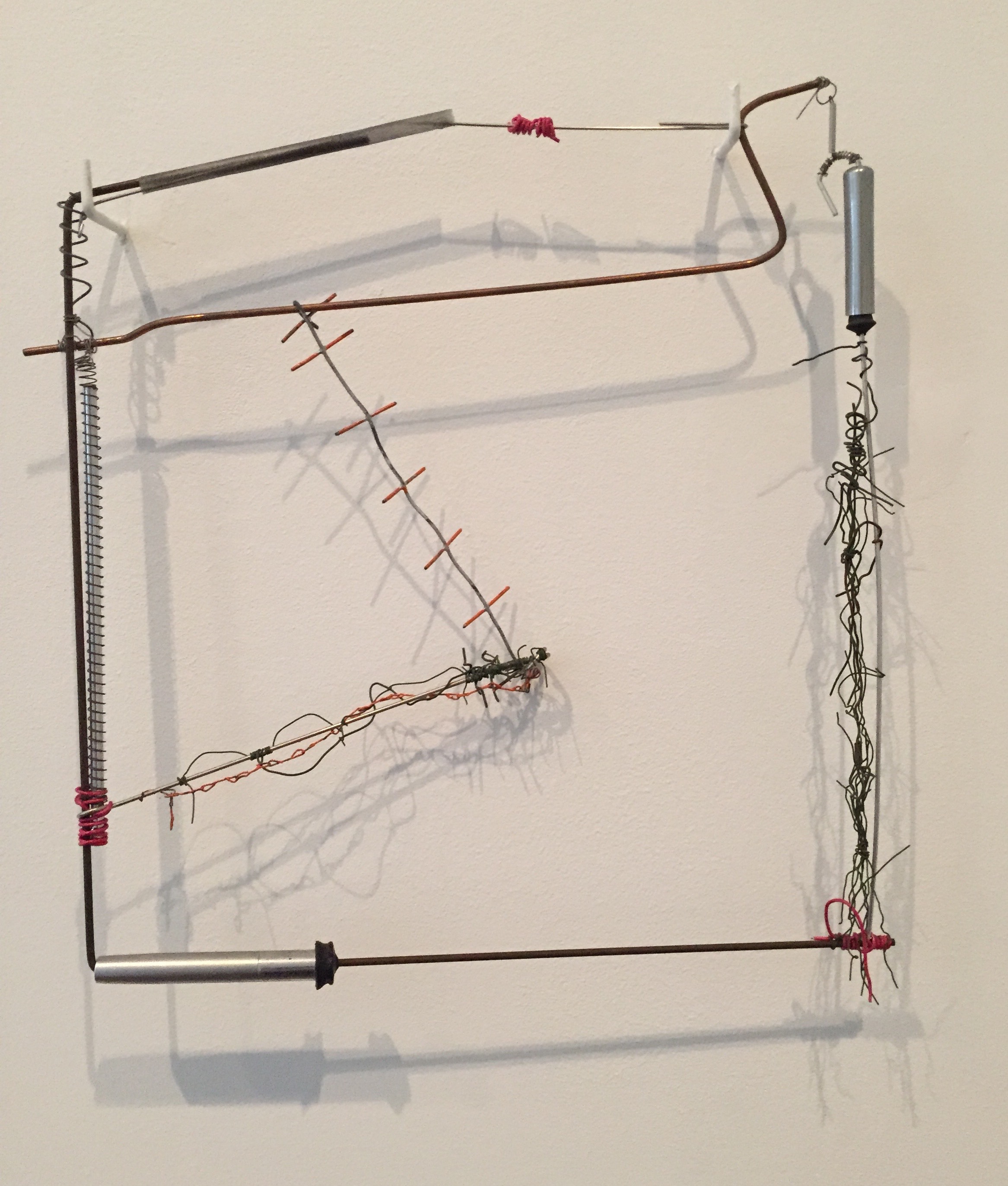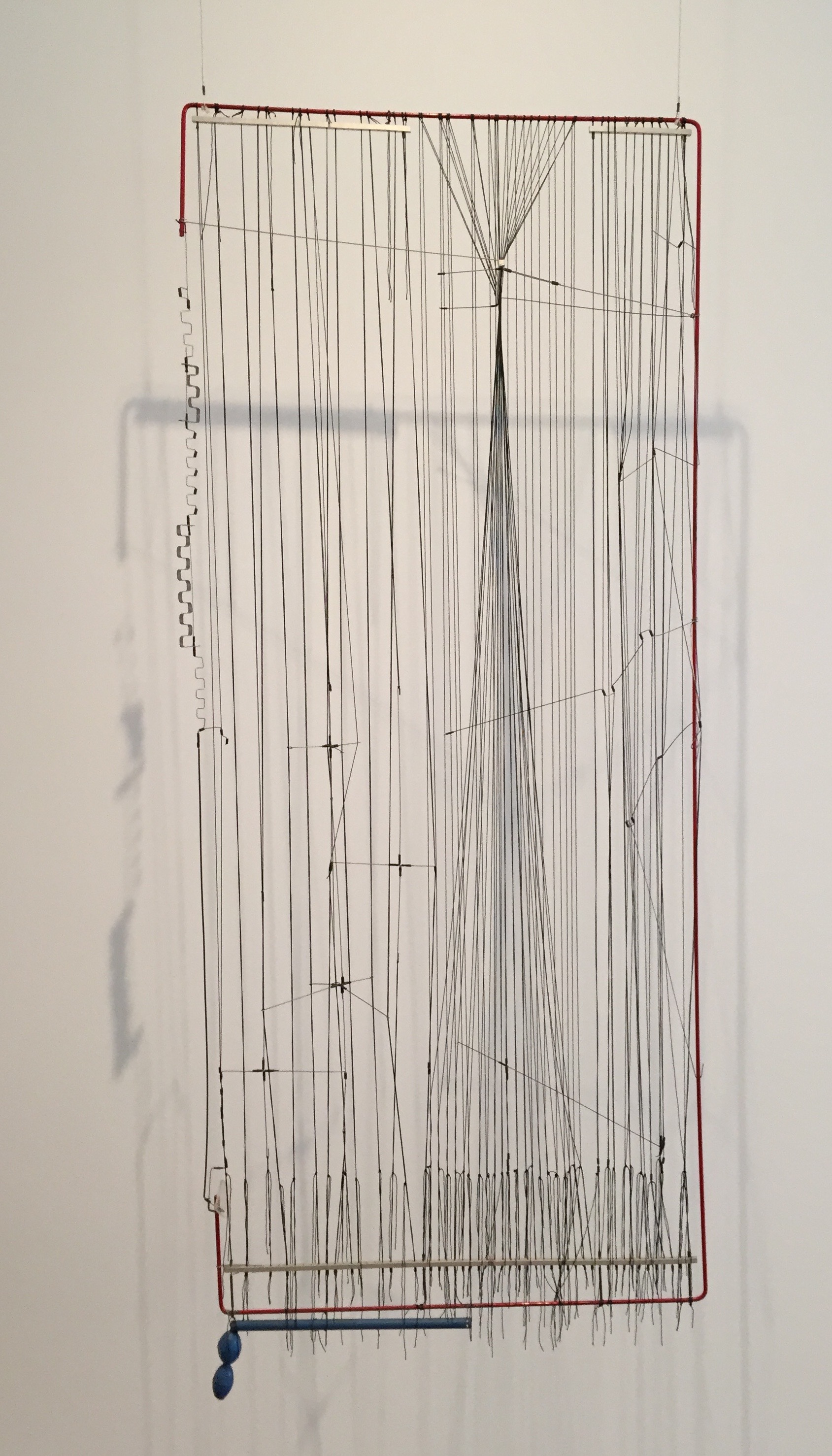 Although Gego’s art provokes artistic references (Robert Storr, when confronted with her work in 2003, suggested a multitude of these), Gego was quite literally on her own tangent. Consider, for example, the Debujo sin papel (Drawing without paper) Series of the late 1980s in which the artist used wire together with various other elements to create works that are planar in structure and pictorial in nature, most of them self-enclosed by square or rectangular frames. In Debujo sin papel 86/15 (1986), for example, the frame consists of a red-painted metal bar that falls just short of describing a rectangle, its form completed by an undulating strip of metal near the top of the left side and by a straight metal bar below. Dark nylon threads extend the length of the piece, the whole suggesting a delicate stringed instrument. At the work’s bottom edge, knotted threads hang loose to be stirred by air currents, adding a kinetic element. The fact that the piece is suspended in front of the wall and throws shadows upon it, which shift as the viewer moves, further activates the work and its linear rhythms.