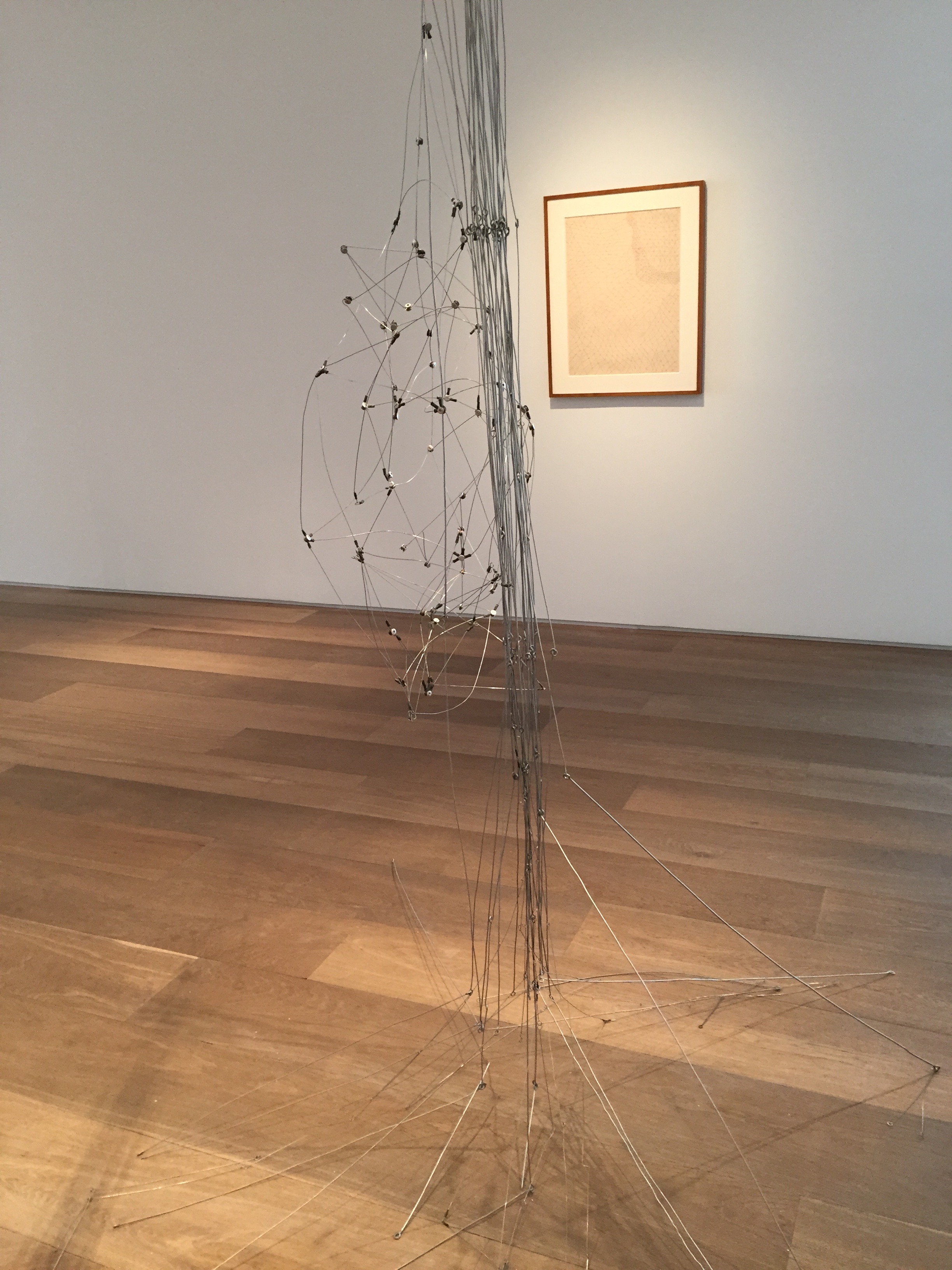 Chorro No.3 (1970) is transparent, largely immaterial and crystalline in shape, yet paradoxically calls to mind Louise Bourgeois’ volumetric, biomorphic and similarly suspended painted bronze Fee Couturiere (1969; see below). While Gego’s labor-intensive art has not been assigned to any “ism,” some of her work seems compatible with that of Bourgeois, Eva Hesse and others associated with Process Art–an art of hand-worked, irregular forms often subject to the force of gravity–that reacted against the industrial manufacture and strict geometry of the Minimal Art that dominated the New York art scene in the early and mid-sixties, a period when Gego was making frequent visits to New York. An artist to whose work Gego’s begs comparison is the “fiber sculptor” Ruth Asawa, the Japanese-American artist based in San Francisco who began crocheting wire into hanging mobiles in rounded, biomorphic shapes beginning in the mid-1950s. One wonders whether Gego and Asawa might have met, as both worked at Tamarind Lithographic Workshop in Los Angeles in the middle sixties. Finally, it would be remiss not to point out that Gego’s predilection for drawing in space with line reaches back in art history to find precedents in Picasso’s welded steel constructions of 1927-31 and Alexander Calder’s wire sculptures begun in the late twenties.