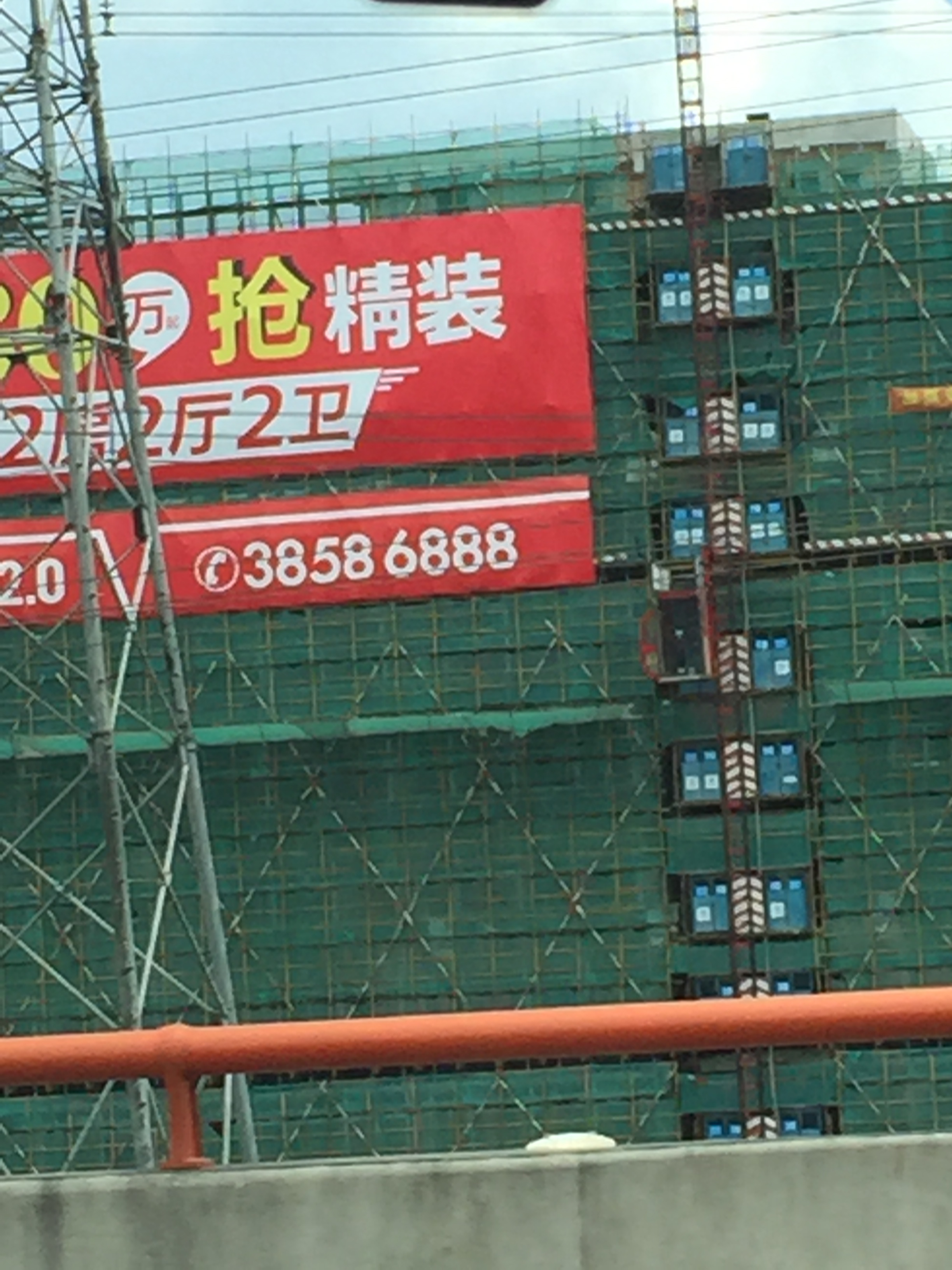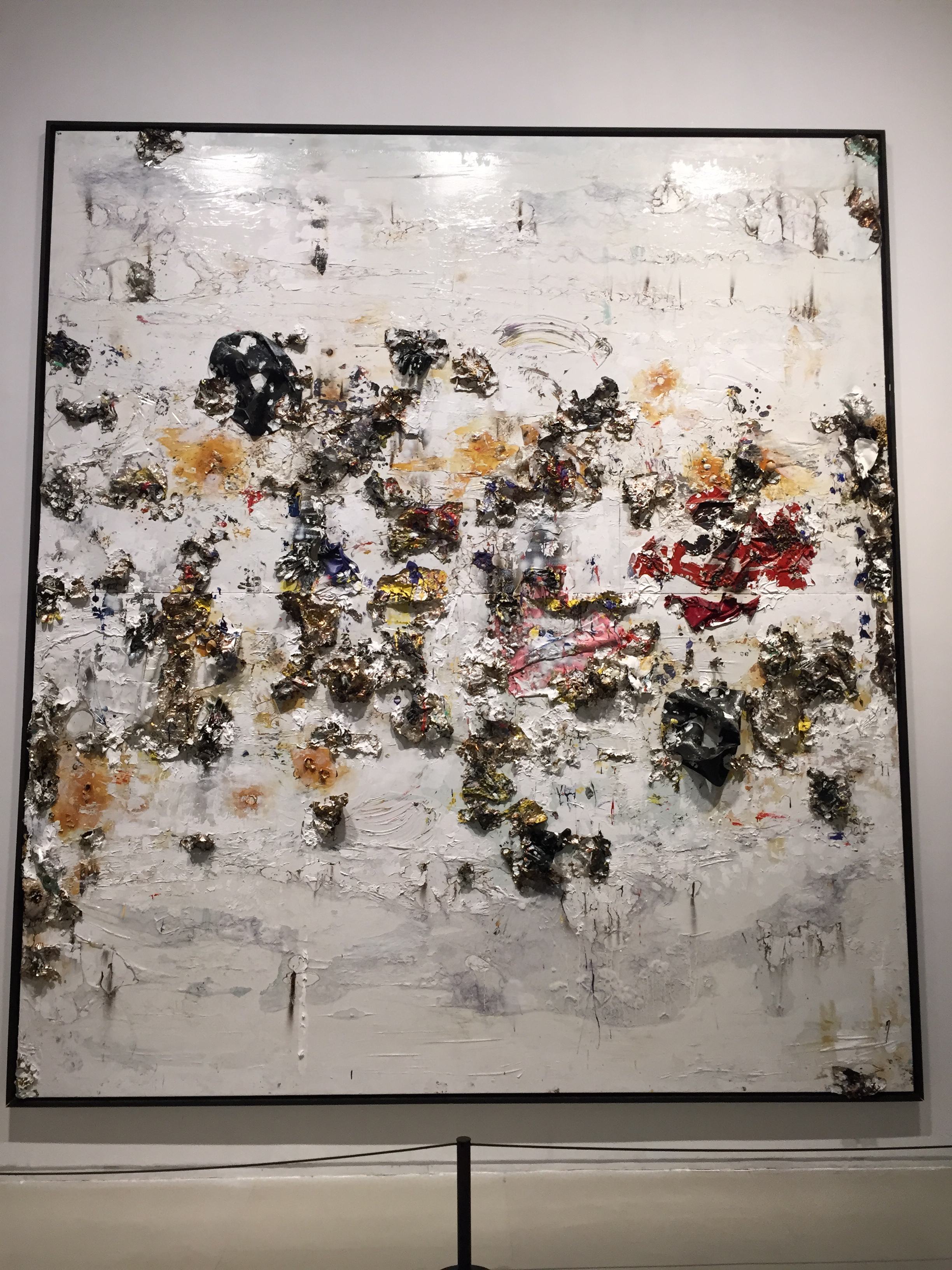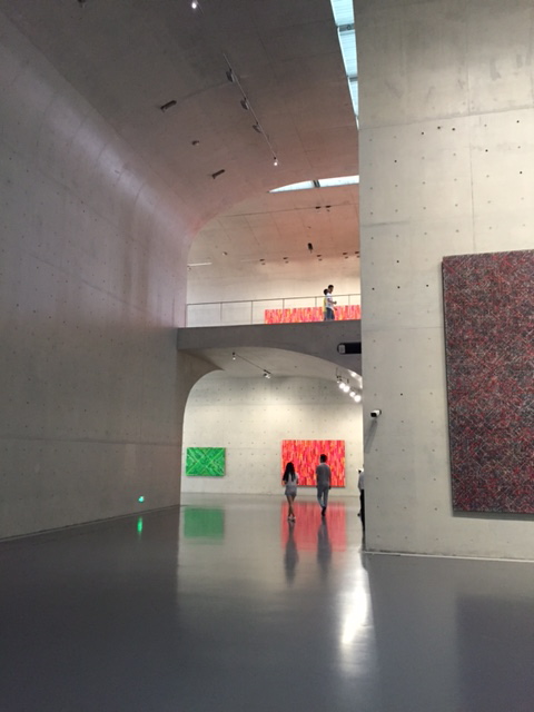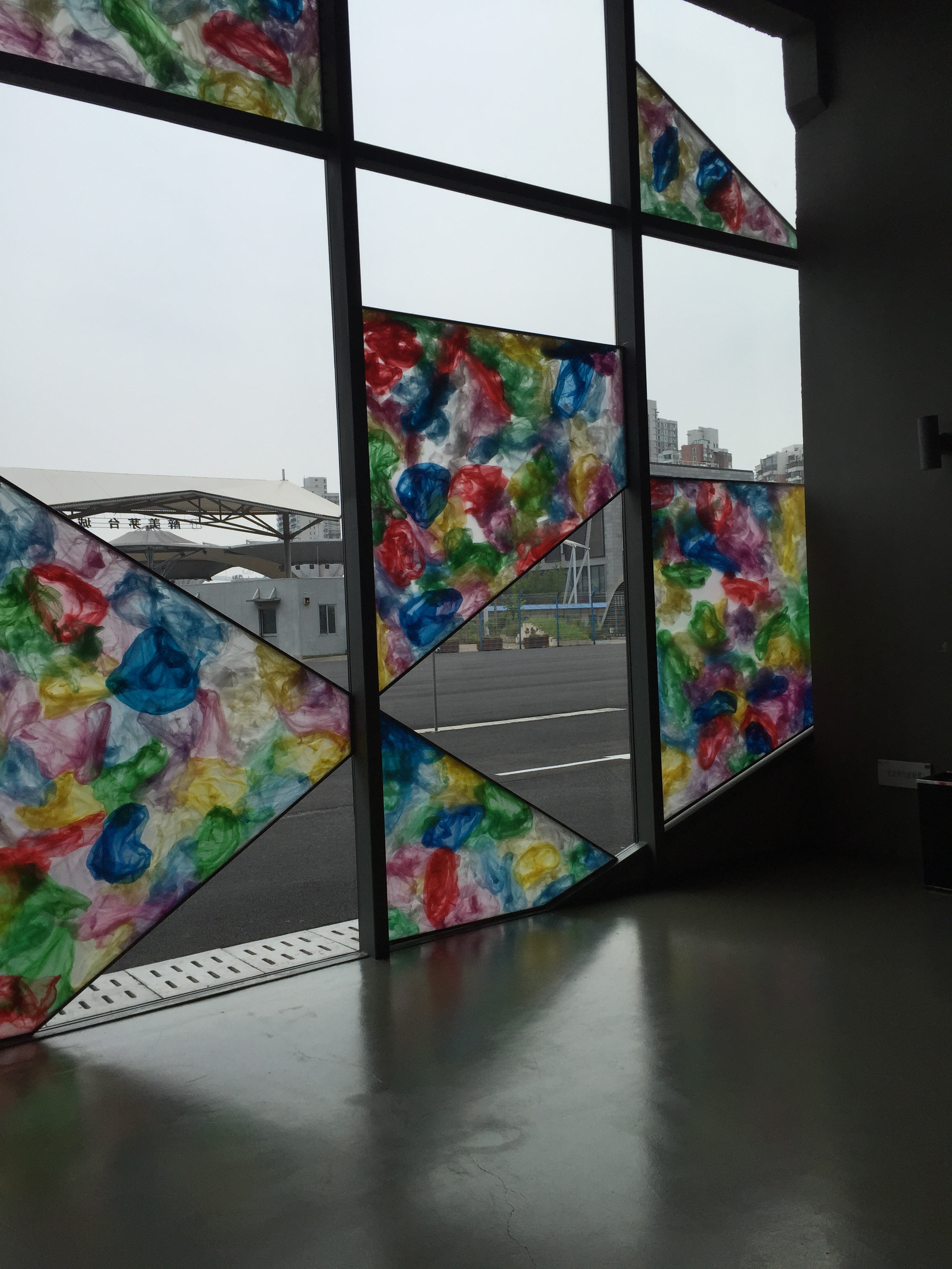 The Long Museum West Bund, which focuses on contemporary art, is housed in a building designed in a lofty, Brutalist style by the architect Liu Yichun of the Shanghai-based Atelier Deshaus. The exhibition of abstract painting I saw there, Ding Yi: What’s Left to Appear, curated by University of London professor Shane McCausland, was uniquely geared to integrating the art with the architecture (wall labels explained, for example, that works in a particular gallery were hung in descending scale order so as to create an illusory lengthening of the gallery space). I found Ding Yi’s retrospective remarkable, as while seemingly hundreds of paintings employing a grid-based mark-making technique covered thousands-upon-thousands of feet of exhibition space, each work appeared to have been individually hand-painted, layered and composed. I was amused to find, moreover, that most of the buildings under construction in Shanghai were cloaked in skins that recalled Din Yi’s paintings (see photo below).